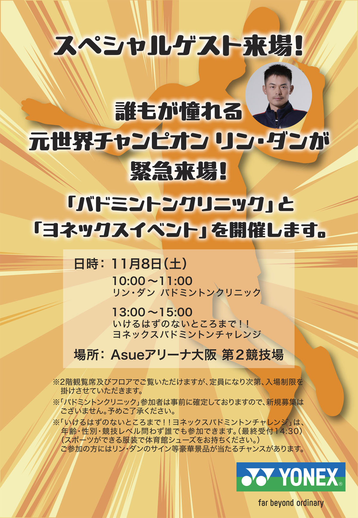 元世界チャンピオン リン・ダンの「バドミントンクリック」と「ヨネックスイベント」が開催されます。